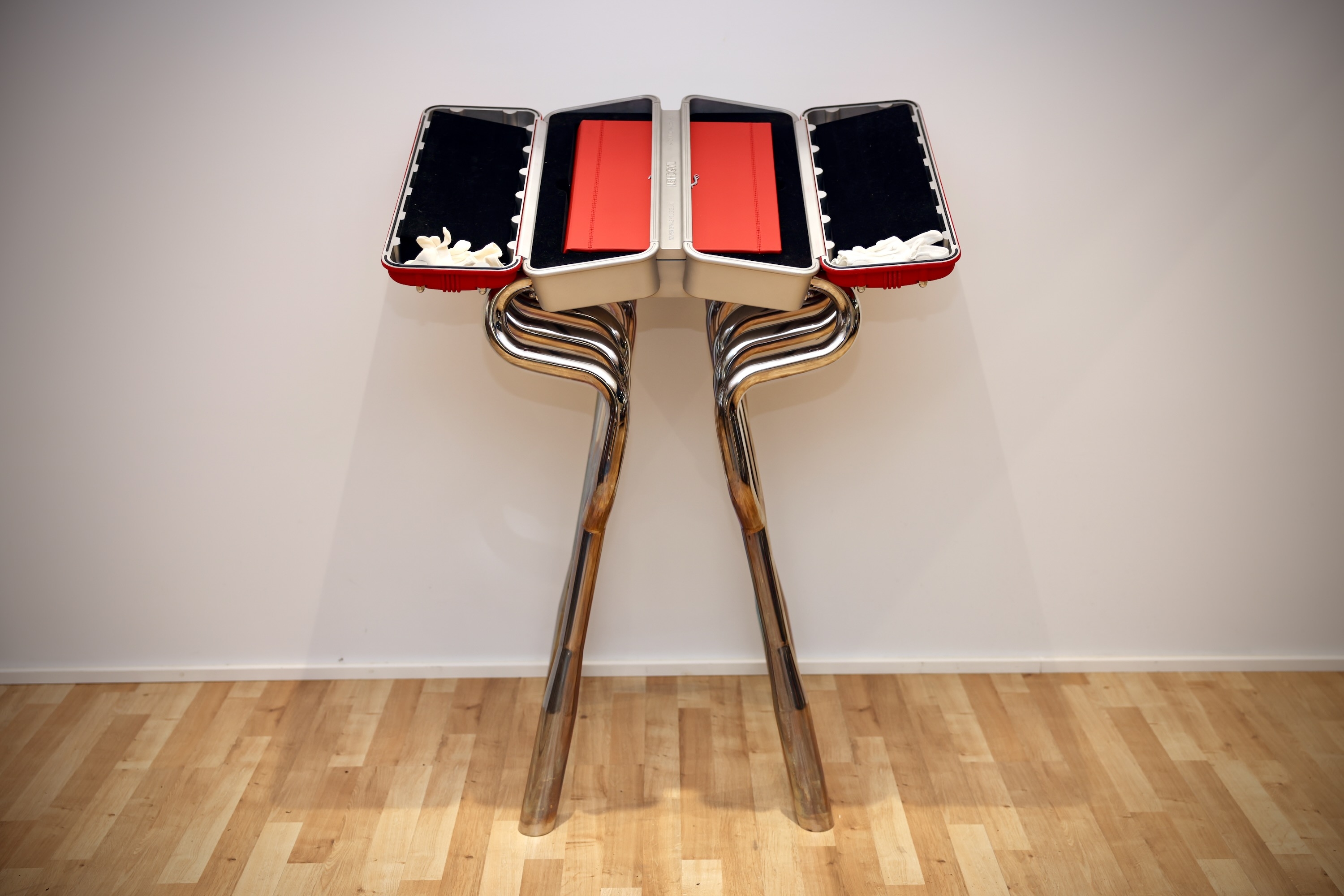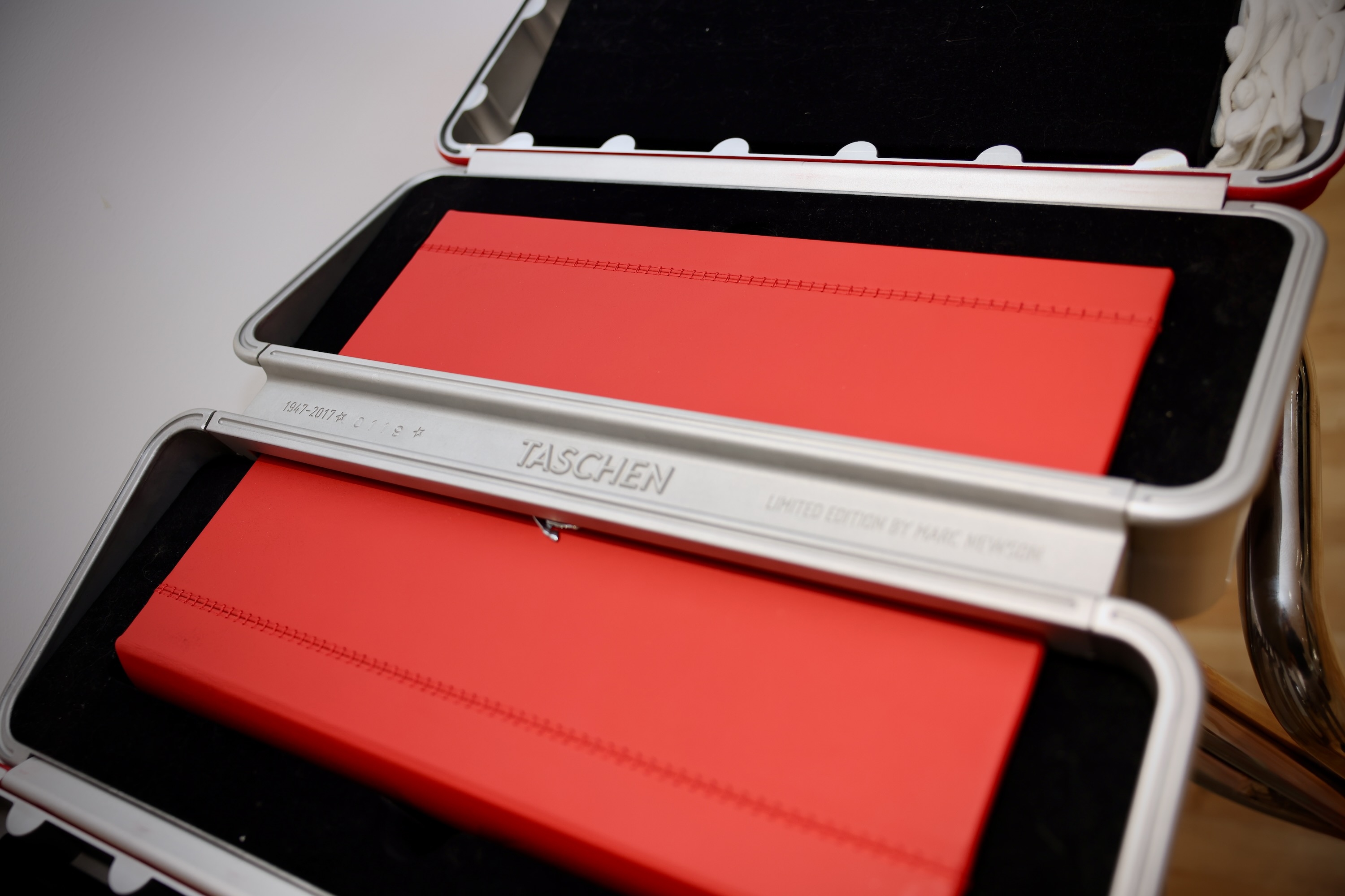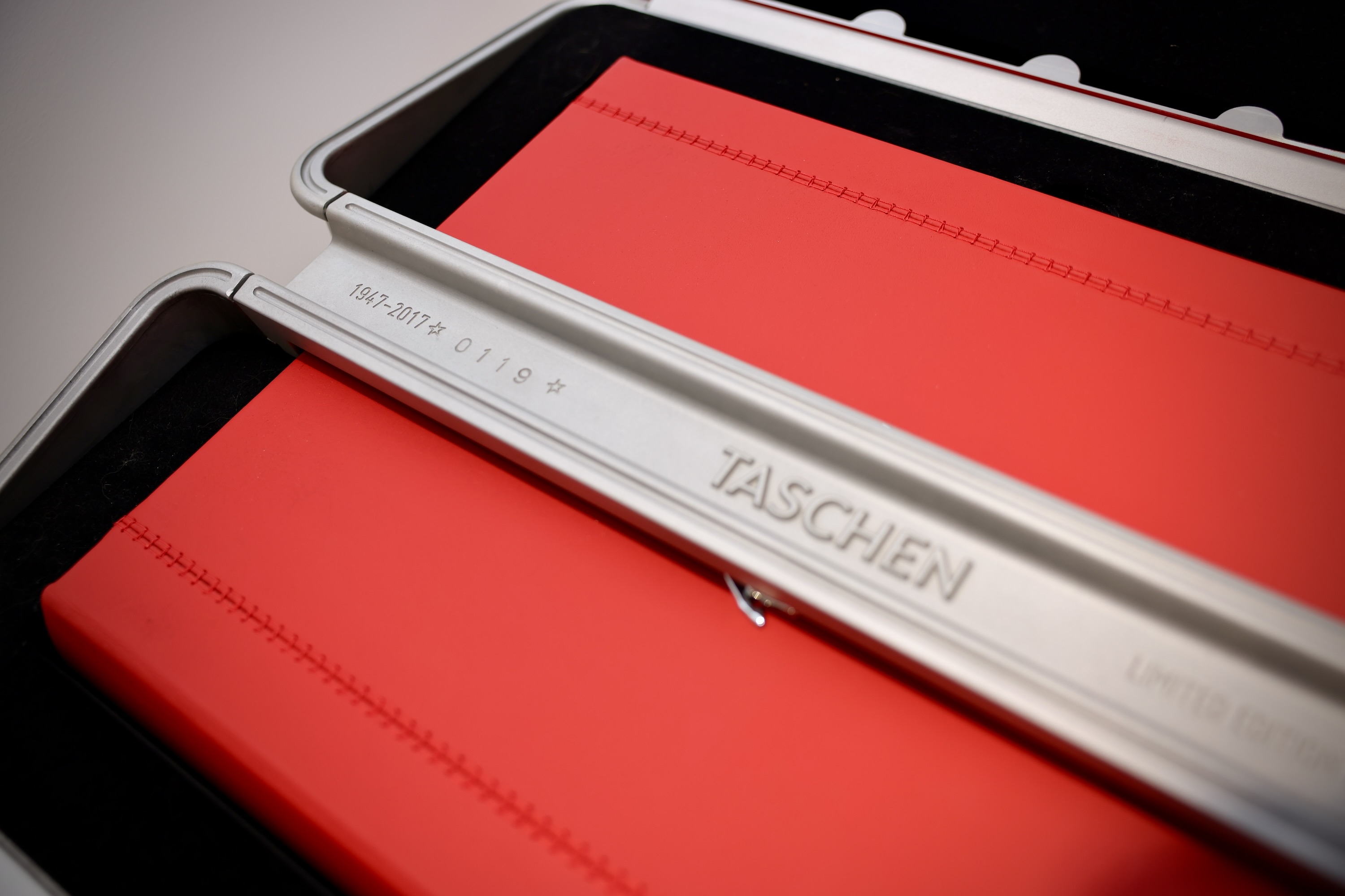 Leather cover, 32.4 x 43.2 cm, 94 kg, 514 pages; in an aluminum engine-inspired case designed by Marc Newson, with a sculptural chromed-steel bookstand, 55 x 57 x 110 cm